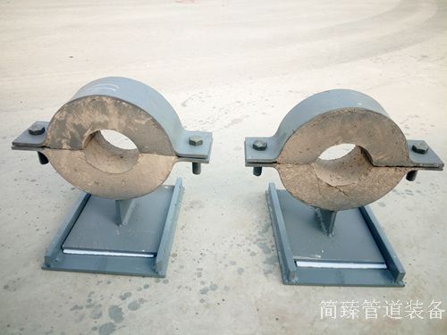 這種新型保冷管托,適用于工作介質(zhì)為輕烴類(lèi)低溫管道設(shè)備及一切制冷和傳輸制冷劑的設(shè)備和管道的支撐受力部位。包括聚氨酯發(fā)泡管殼、聚氨酯發(fā)泡管托,管殼的斷面呈半圓環(huán)形,管托的上部斷面呈半圓環(huán)形,管托底部設(shè)有不銹鋼薄鋼板,薄鋼板上面兩邊固連有角鋼,薄鋼板、角鋼與管托一次發(fā)泡成型,薄鋼板下面靠接有聚四氟乙烯板,該板嵌入下面鋼板的長(zhǎng)方形凹槽內(nèi)并與之固連,低溫管放置于管殼、管托蓋合的圓孔內(nèi),將管殼與管托固連,本實(shí)用新型經(jīng)鋼板與支撐管架固連。